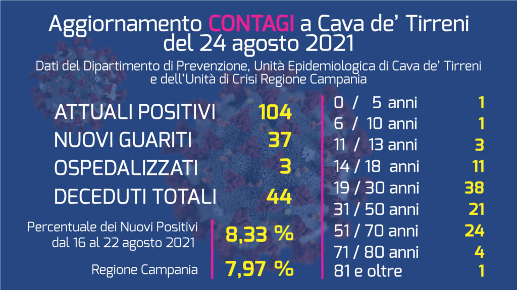 Come di consueto, il Primo Cittadino di Cava de’ Tirreni Vincenzo Servalli mostra l’ultimo report dell’Unità Epidemiologica dell’Asl Salerno sulla situazione Coronavirus in cui risultano: 104 cavesi attualmente positivi al Covid-19, 3 ospedalizzati, 37 nuovi guariti e 44 deceduti totali. La percentuale dei nuovi positivi dal 16 al 22 agosto 2021, è del 8,33%.