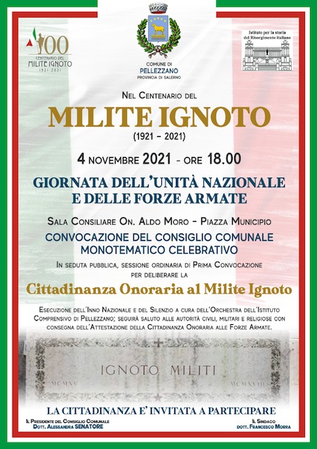 Con una lettera indirizzata al Presidente della Repubblica, e per conoscenza al Ministro della Difesa, dal Capo di Stato Maggiore della difesa, al Presidente della Regione Campania, al Presidente della Provincia di Salerno, al Prefetto di Salerno, al Presidente dell’Anci, al Commissario Generale per le Onoranze ai Caduti e al Presidente del Gruppo delle Medaglie d’Oro al Valore Militare d’Italia, il Comune di Pellezzano, guidato dal Sindaco dott. Francesco Morra, il prossimo 4 Novembre delibererà la Cittadinanza Onoraria al Milite Ignoto.